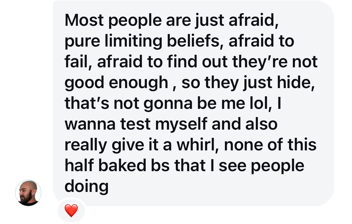 One day, my mate Kido sent me a message that resonated in the best way. He said: "Most people are just afraid, pure limiting beliefs, afraid to fail, afraid to find out they're not good enough, so they just hide, that's not gonna be me lol, l wanna test myself and also really give it a whirl, none of this half baked bs that I see people doing"